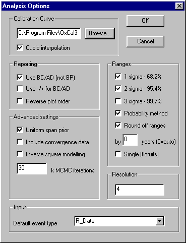 There may also be other forms of information which you wish to include in a study. Many of these it will be possible to write in the form of calendar ages in conjunction with `stratigraphic' information. It is also possible with this program to define your own probability distributions and use them in the analysis (Prior).