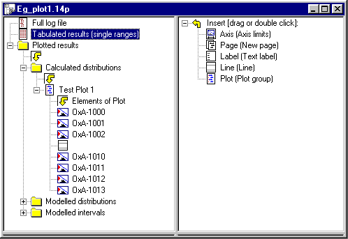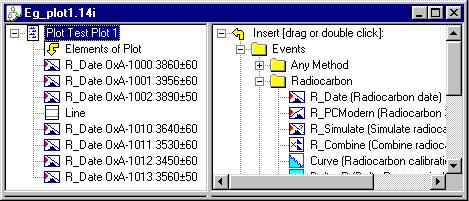 To produce a series of plots is almost as simple. First press the button to get a new plot input window. You will see that this window has two visible panes. Drag the (radiocarbon date) icon from the right hand pane onto the (plot) icon in the left hand pane. Fill in the details of the radiocarbon date in the dialogue box. Repeat this operation as many times as you wish to build up the plot. The order can be changed, if you wish, by dragging the icons around.